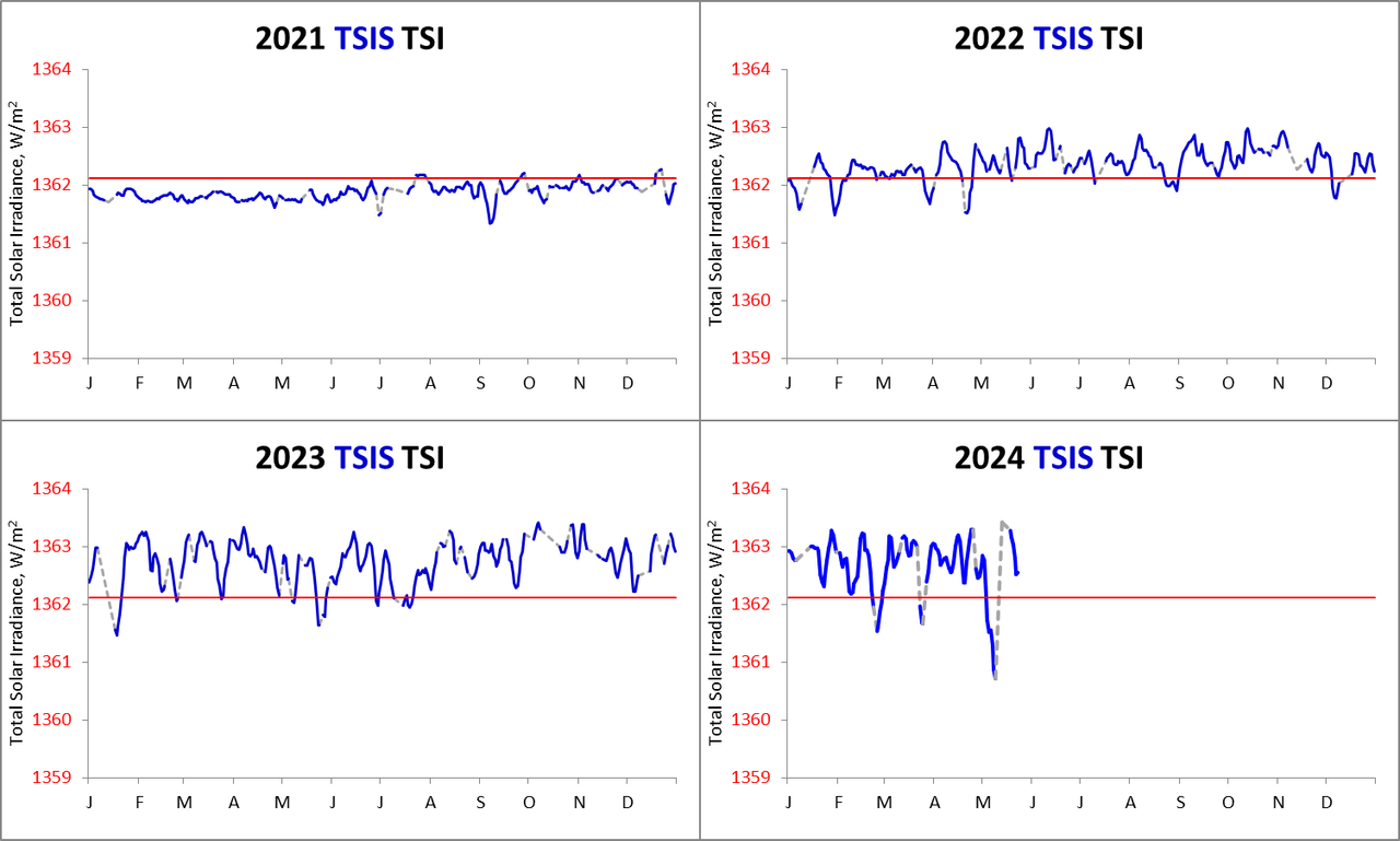 The information from the Nature paper indirectly helps to establish this ocean warming effect where/when the seasonal sun passes over during reduced cloud cover, and its detrimental effect on corals, at the time of rising TSI above the decadal ocean warming threshold (the red line in TSI plots below).