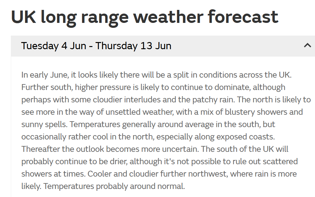 Have to say that when you read what they call their Long Range Weather Forecast its impossible to tell what the writer(s) think the UK weather is going to be like during the period covered. But that’s quite usual, when there is no blocking high or long sequence of lows moving over, the UK weather is just about impossible to forecast.