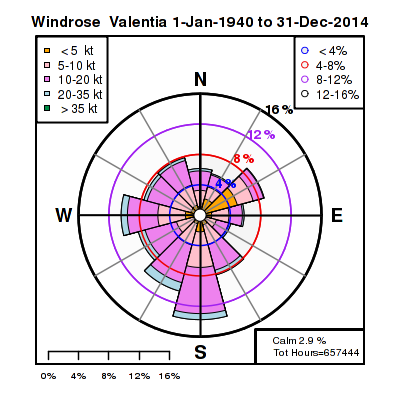 Valentia Observatory is 1km west of Cahirciveen, Co Kerry and a weather station has been operated in the area, with some temperature records for 1850-51 and continuous daily min-max records since mid-January 1872. The historical data sets have been carefully transcribed and are available from Met Éireann, 1850-1920 and 1921-1943. In 1944 Met Éireann did something a bit unusual, they started measuring the temperature every hour. Rain or shine, sleet or snow, the diligent staff of Met Éireann would go out to the weather station and record the temperature. Between January 1944 and April 2012 when the station was replaced with an automated station only 2 hours were missed. The data set from 1944 onwards is available from the Irish Government website: daily summary (includes minimum and maximum temperature) and hourly measurements.