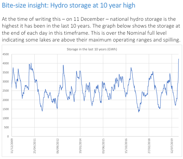 The storage isn’t that much – if all the lakes are full (which is very rare) it is 5TWh capacity in 45TWhpa grid. Usually, the lakes sit in the 2-3TWh range, and they can go down at about 4-500GWh a week. They have a panic stations level of about 1TWh storage, They need that water for peaking.
