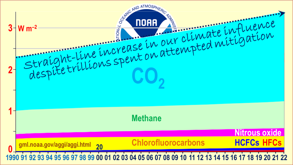 All those trillions spent – in the West almost alone – on attempted emissions abatement have had no discernible effect whatsoever on the near-perfectly linear growth rate of anthropogenic forcing over the past one-third of a century since IPCC’s first report in 1990.