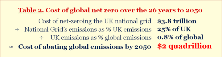 The global cost of attaining net zero, extrapolated pro rata from the estimated $3.8 trillion cost of net-zeroing the UK power grid, which accounts for just 25% of all UK emissions, which in turn represent only 0.8% of all global emissions, might reach $2 quadrillion: