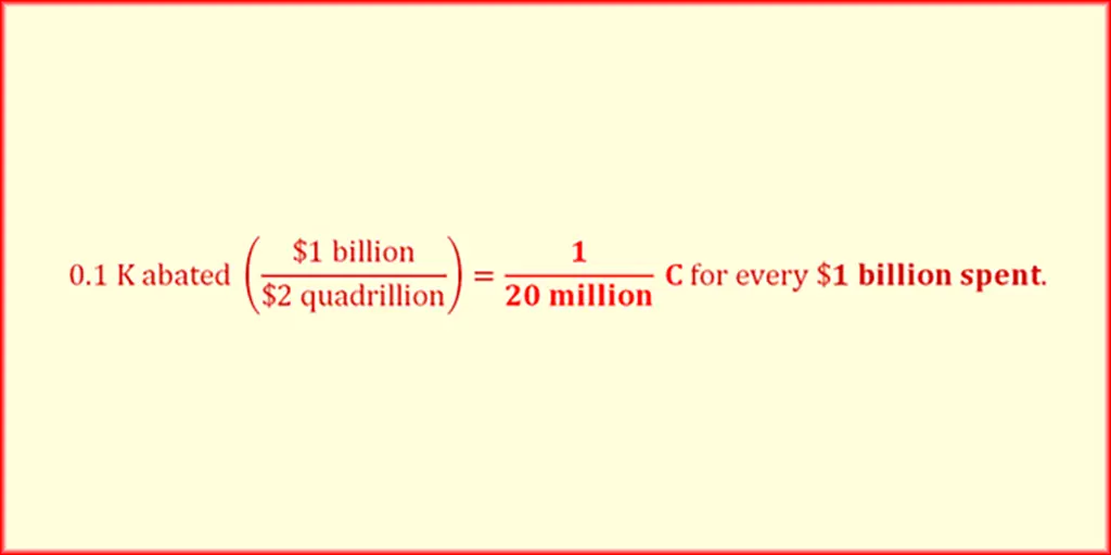 $2 quadrillion over 26 years is about $77 trillion per year. That is about the same as the current gross world product. In other words, we could maybe get to net zero if we spend 100% of every country’s output toward the goal. Actually, we would probably reach the goal early because most of humanity would be dead.