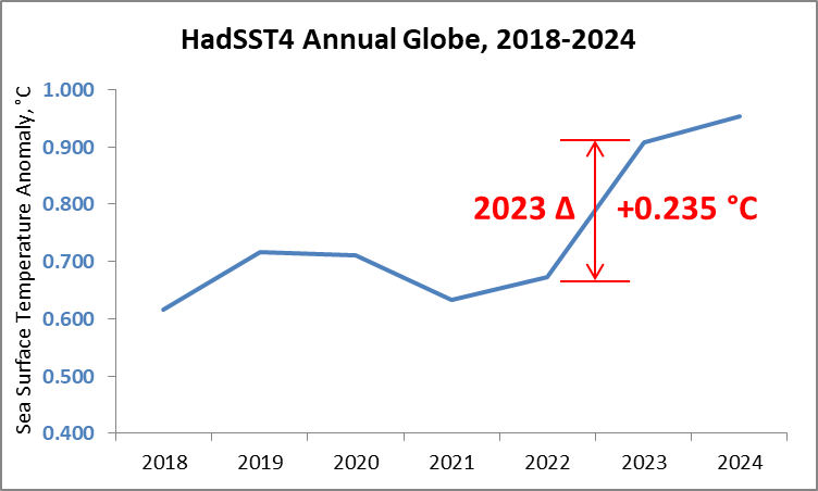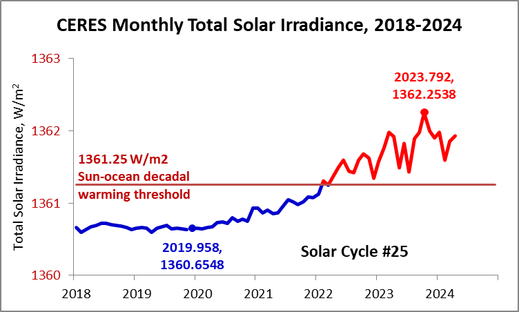 The warming you mentioned peaked in 2019/2020, and declined into 2021, but as you can see it didn’t warm up very much compared to the decadal SST step driven by the increase in solar cycle #25 irradiance taken in 2023/2024.