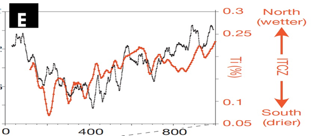Research has also found that as the ITCZ moved southward over the past 6000 years, El Nino activity has increased. El Nino events caused extreme drought in southeast Asia in 1998, as well as in southern Africa such as was recently experienced in 2023-2024. Likewise, the Great Famine of the 1870s coincided with the strong El Nino of 1877-1878, while the ITCZ was at its most southward location (graphic E).