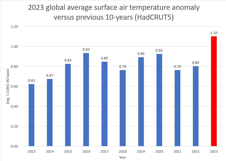 For atmospheric temperature he uses the surface air temperature numbers from the Hadley Center Climate Research Unit (HadCRUT). [Unlike others such as NASA-GISS and NOAA, this dataset does not include “imputed” data.] Humlum shows his calculations of the Surface air temperature anomaly for 2023 vs last ten 10 years. Importantly, he also shows the entire dataset for the USH MSU global temperature anomaly, which is calculated from satellite data [the only true global dataset of temperature trends].