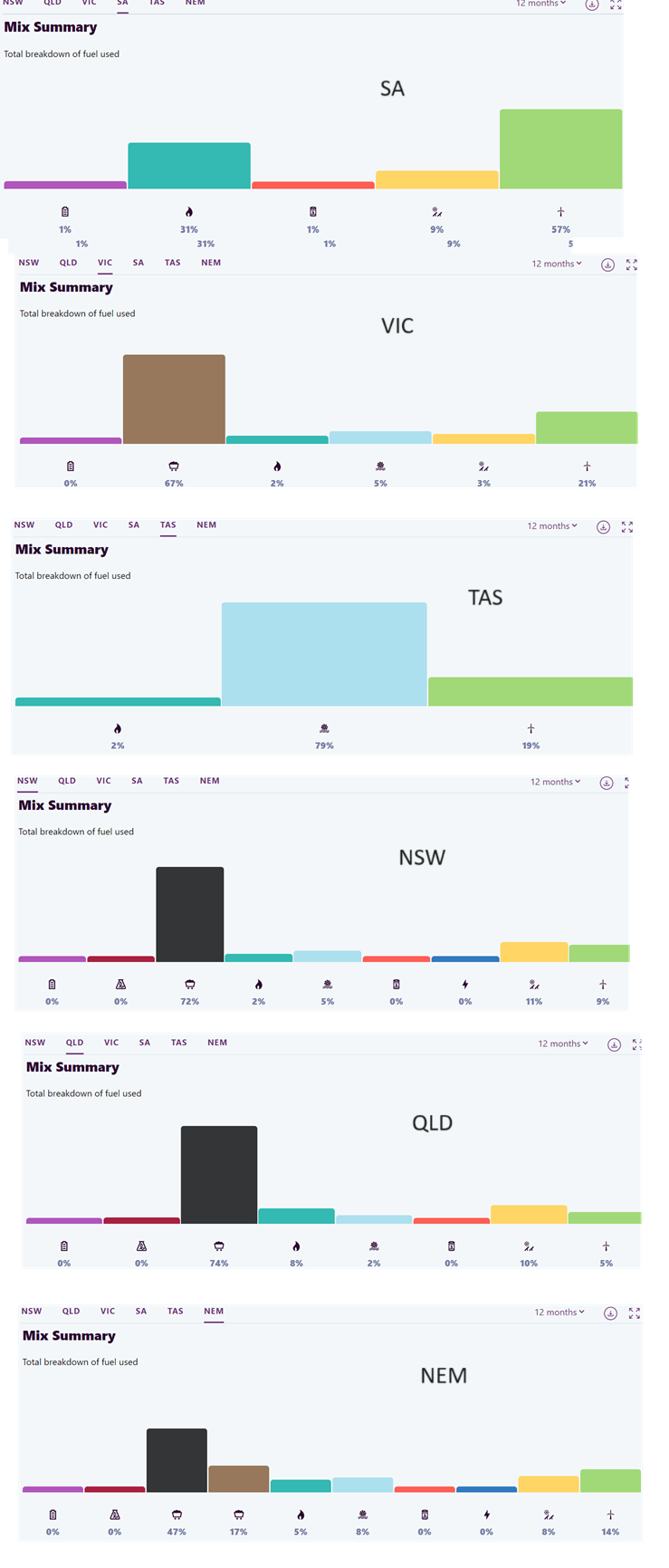 In terms of faster rollout, here is a composite graphic of the various fuel mixes of the states (actual generation %) over the last 12 months SA has wind 57%, grid solar 9%. Vic has wind 21%, solar .