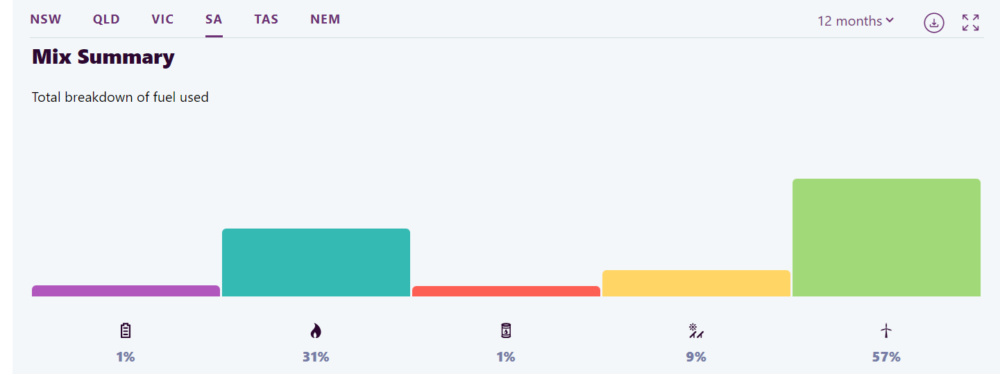 Here is the total generation for SA over the last year, from the AEMO dashboard. 57% wind, 31% gas, 9% grid solar. But that leaves out the huge rooftop solar.