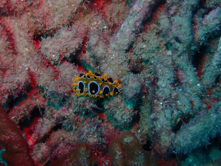 Stare long enough amongst the dead corals and you find all sorts of things, including nudibranchs. My photographs, wide angle and close-up, are of a gold and blue tiny Phyllidia ocellata.