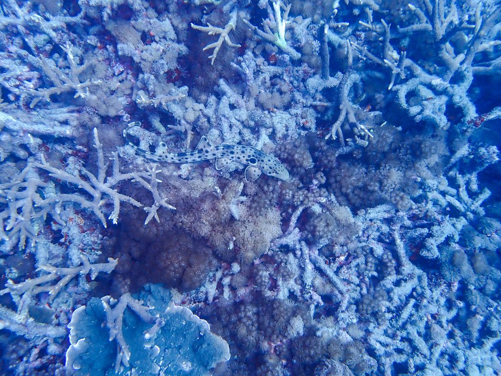 One of the highlights of the dive last Friday was to see two Epaulette sharks (Hemiscyllium ocellatum). One of them lay across an area of broken and mostly dead coral. My wide-angle photograph of the shark with buddy Jen photographing it allows some assessment of how much, and what all this dead coral looks like in this area at about 10 metres depth. And it was not easy to spot the shark, its natural colours merged with the algal infested coral.