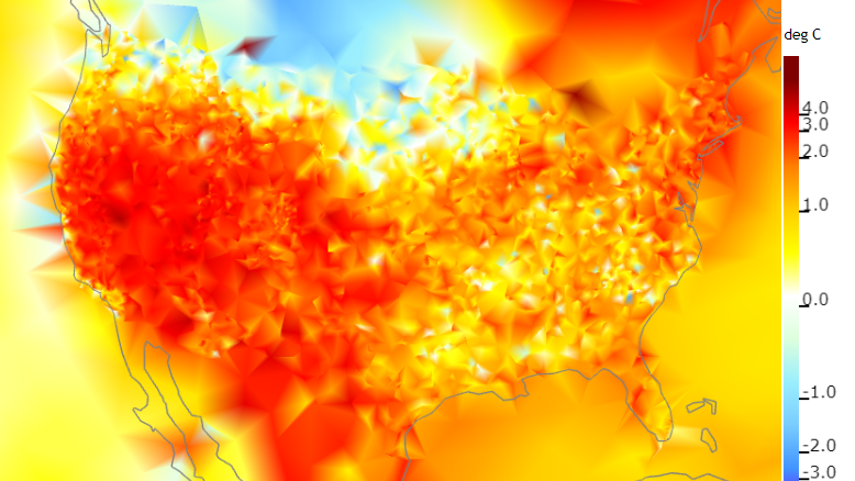 These are not real absolute temperatures they are simply ΔT’s from a baseline. You can’t look at this and say any one place is warmer than another. You can only say that it had a higher rate of change from a baseline.
