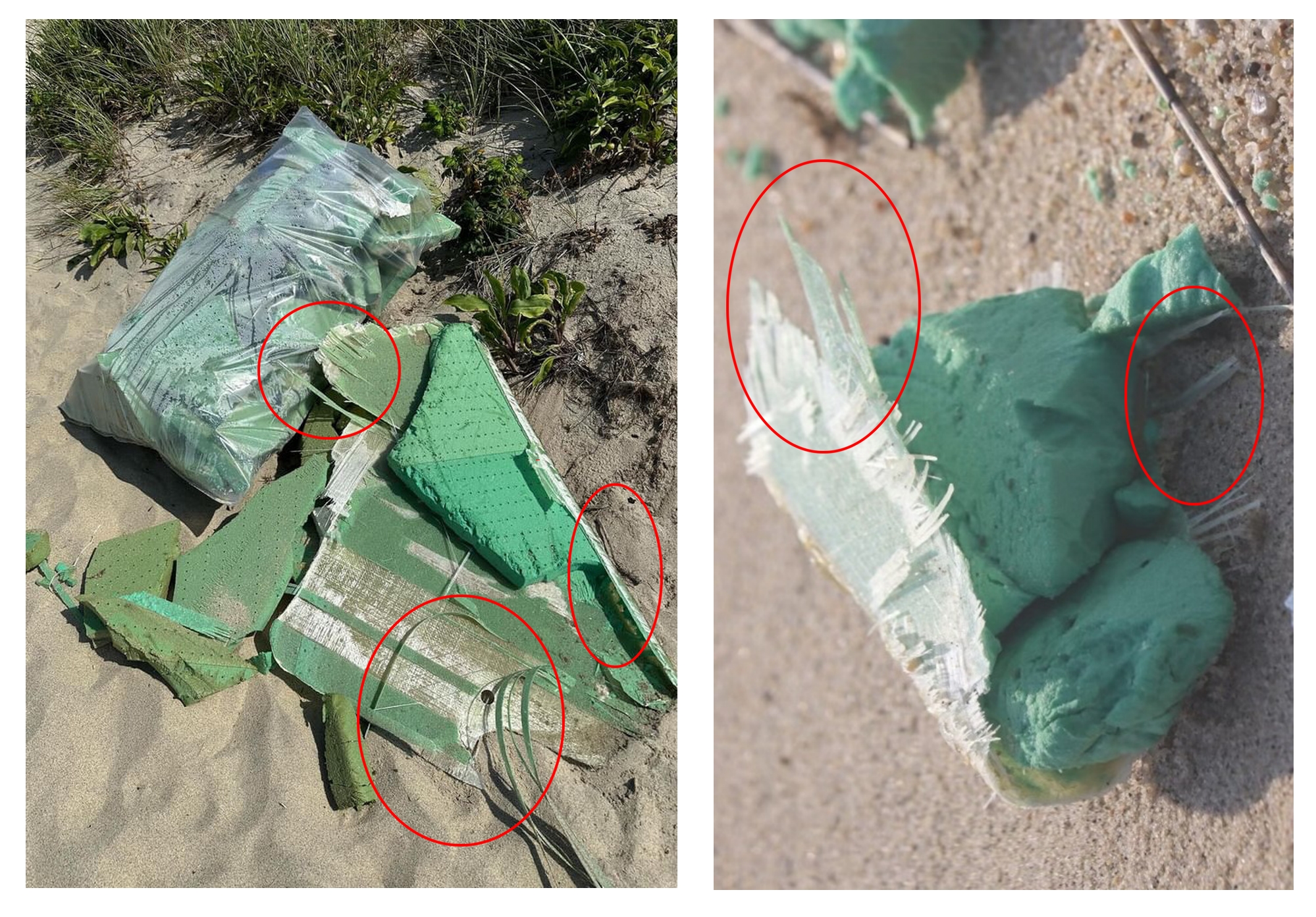 These small shards from turbine blades will wash ashore and are a puncture danger to beach goers. Cleanup to remove these dangers from beach sand will be difficult.