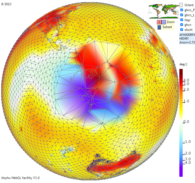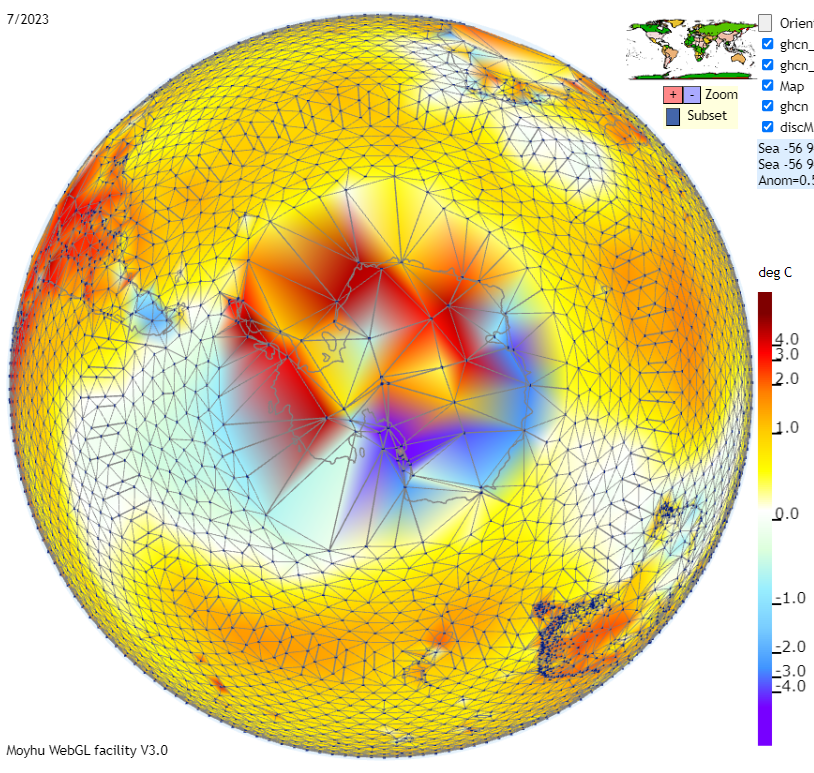 Here is a better projection for surface average anomaly. The color is exact for stations, shading in the triangles between. It seems more than half was cold, but much of the rest very warm.