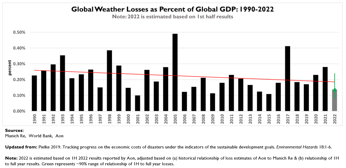 From an investor’s perspective, it’s all about money. The biggest thing about extreme weather events is that they destroy property, but even the trend in property losses has declined as the Earth has modestly warmed: