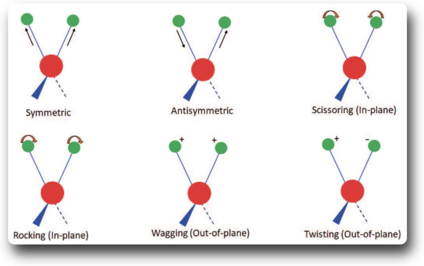 There are a number of possible types of vibrations of the atoms around their bonds, shown below from the same source.