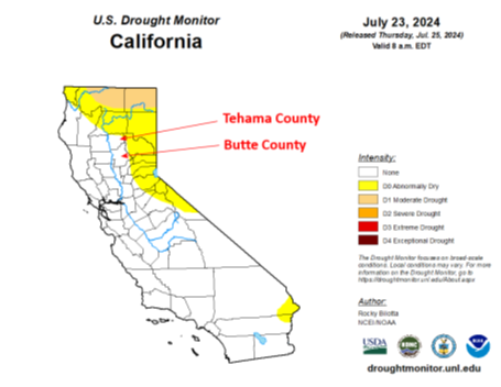 While there was indeed a heat wave prior to the Park fire, that had no bearing on the fire at all. The area where the fire ignited, Butte County California and the most-burned area in Tehama County are not in drought conditions according to the U.S. Drought Monitor for July 23rd – the day before the Park fire was ignited by a criminal arsonist.