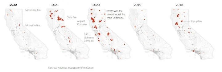 Clearly, there is no climate change driving component to California wildfires at all. If there were, fires in the present would be consuming much more than 4.4 million acres annually – but this isn’t happening. The simple fact is, Arsonists Are Responsible for More Wildfires than Climate Change. The intensity and coverage of wildfire varies greatly from year to year, as evidenced by the 2022 NYT story, Why California’s 2022 Wildfire Season Was Unexpectedly Quiet. A map of fires from year to year in the article demonstrates this well: