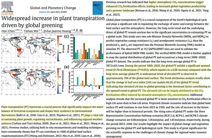 “The trend attribution analysis results show that the change in leaf area index (LAI) can explain 66.2% of the global PT trend, indicating that elevated LAI due to global greening is the dominant factor contributing to the upward trend in global PT. The elevated LAI can be largely attributed to the CO2 fertilization effect induced by elevated atmospheric CO2 concentration.”