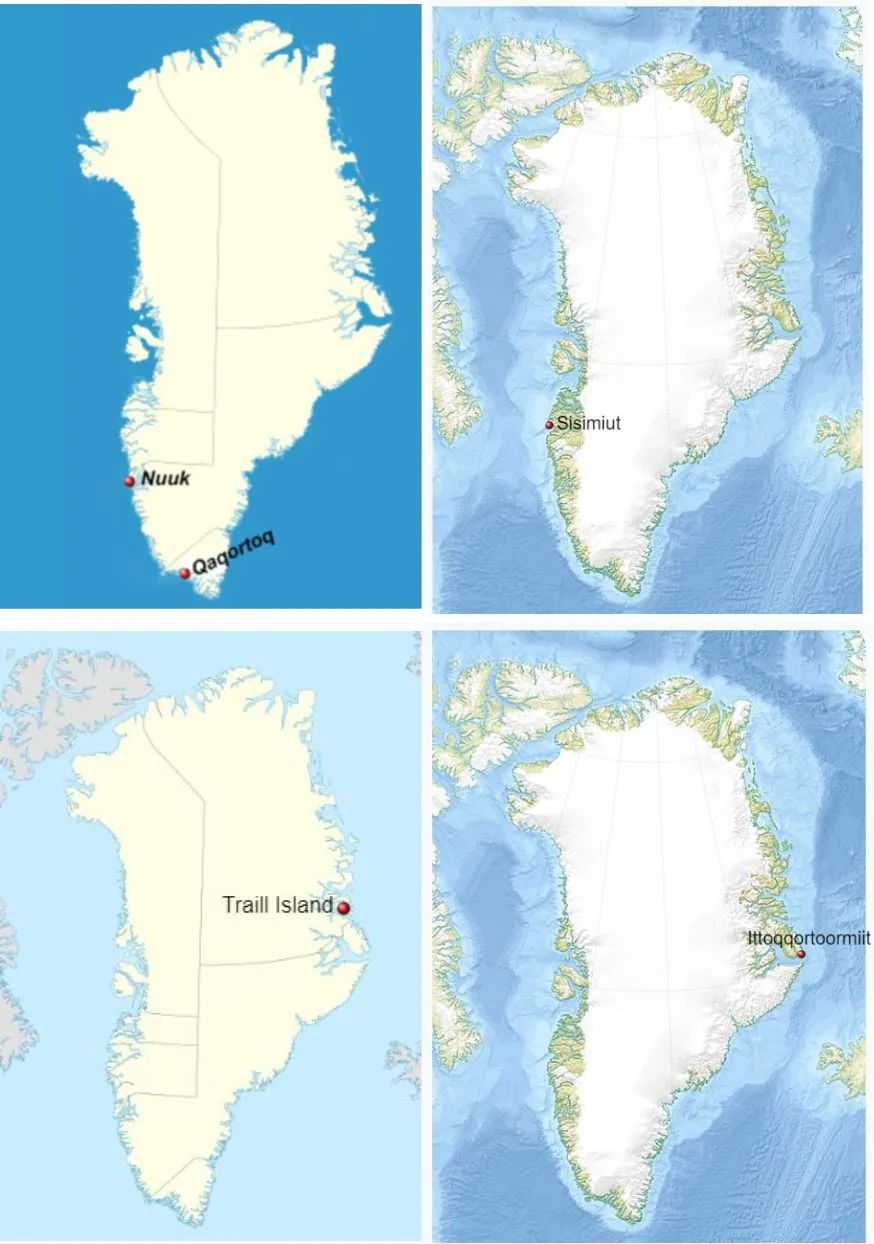 Locations of sightings and problem bears are Ittoqqortoormiit (2 bears shot in the community), Traill Island (attack on a visiting researcher, E. Greenland), Nuuk (SW. Greenland), Qaqortoq (several bears shot, S. Greenland), the trail between Kangerlussuaq and Sisimiut (2 bears sighted, W. Greenland).