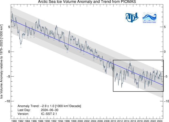 In addition to sea ice extent, an important climate indicator to monitor is sea ice volume as it depends on both ice thickness and extent. Arctic sea ice volume is difficult to monitor on a continuous basis as observations from satellites, submarines and field measurements are all limited in space and time. As a result, one of the best ways to estimate sea ice volume is through the usage of numerical models which utilizes all available observations. One such computer model comes from the University of Washington and is called the Pan-Arctic Ice Ocean Modeling and Assimilation System (PIOMAS, Zhang and Rothrock, 2003). This model-derived Arctic sea ice volume shows a steady downward trend from the middle 1990s to the low point that was reached in 2012. Since then, Arctic sea ice volume has been showing resiliency with a general sideways trend during the past several years.