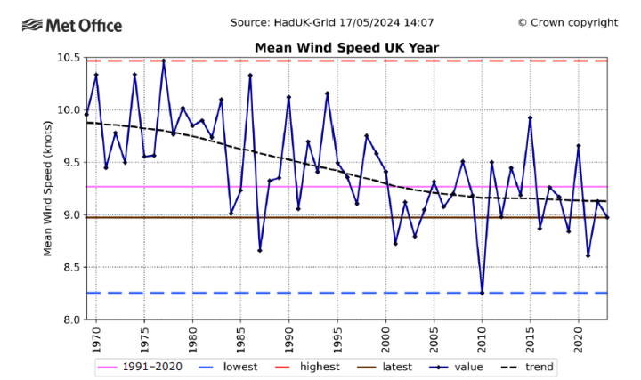 As well as peak speeds, mean wind speeds seem to have fallen over time as well:
