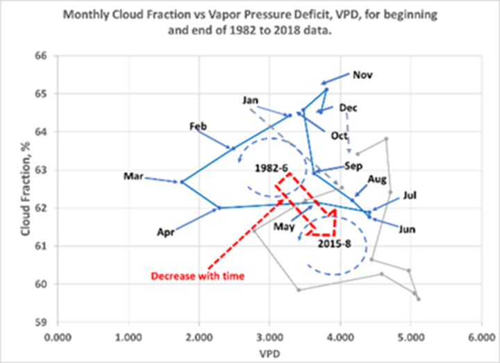 VPD may correlate to cloud cover reflectivity (albedo) in the Dubal et al (2022) CERS data analysis. Dubal et al (2022) (6) showed that the reflectivity of cloudy areas where 2x the reflectivity (short wave radiation out) of clear sky areas, resulting in albedo reduction of the earths cloudy areas being 85% of the total earth’s albedo for the 19 years of data.