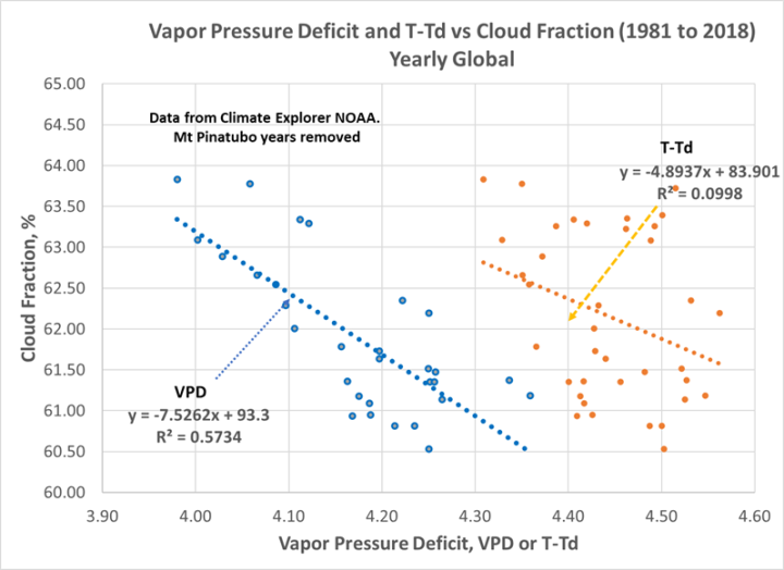 Correlating VPD or T-Td to CC is shown in Figure 5. VPD, (Pws-Pw), is a better correlation to cloud cover. Note the Mt Pinatubo years 1992 to 1998 were removed (Mt Pinatubo ash increased cloud cover in those years).