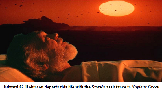 Ted Turner might have got his cannibal inspiration from the cli-fi MGM movie Soylent Green of 1973, which foresaw global warming turning New York City in 2022 (yes, 2022) into a downmarket version of Mumbai and, by the look of it, run by Democrats. The usual odd pair of detectives comprises Robert Thorn (handsome tough guy Charlton Heston, after he got into his Moses robes) and Edward G, Robinson as his clapped-out pal Sol Roth, who complains, ” How can anyone survive in a climate like this, a heatwave all year long, the greenhouse effect, everything is burning up!” [1]