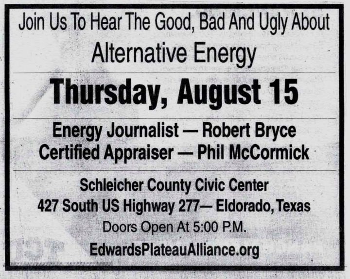 On Thursday, I’ll be speaking about hydrogen and alt-energy in Eldorado, Texas. I was invited to speak in Eldorado by a group of local ranchers who are concerned about a proposed hydrogen project in Schleicher and Tom Green Counties that is being pushed by ET Fuels, a Dublin-based firm. The event is free and open to the public. The caption for my talk: “Money, Physics, & The Backlash Against Alt-Energy.”