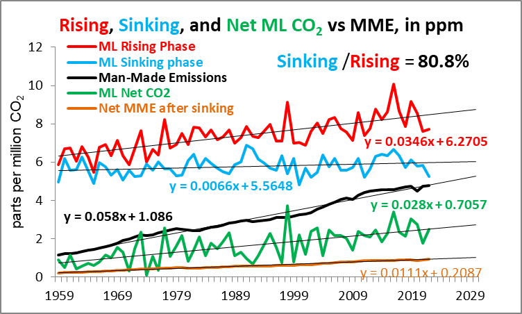 You wonder why I started 1959? That’s the year when the rather high quality CO2 concentration measurements began at Maona Loa. Unfortunately I see little point in asking what happened before that, because the calculations I made require