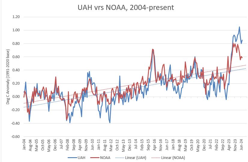 On the contrary, the warming shown in UAH is statistically significant. Indeed, over the past 20 years the warming in UAH was faster than in NOAA!