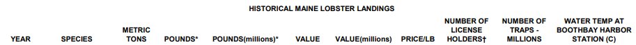 B) The main post has a link to https://www.maine.gov/dmr/sites/maine.gov.dmr/files/docs/lobster.table.pdf – It has data going back to 1880. Back when lobster sold for $0.02/lb. Those were the days.