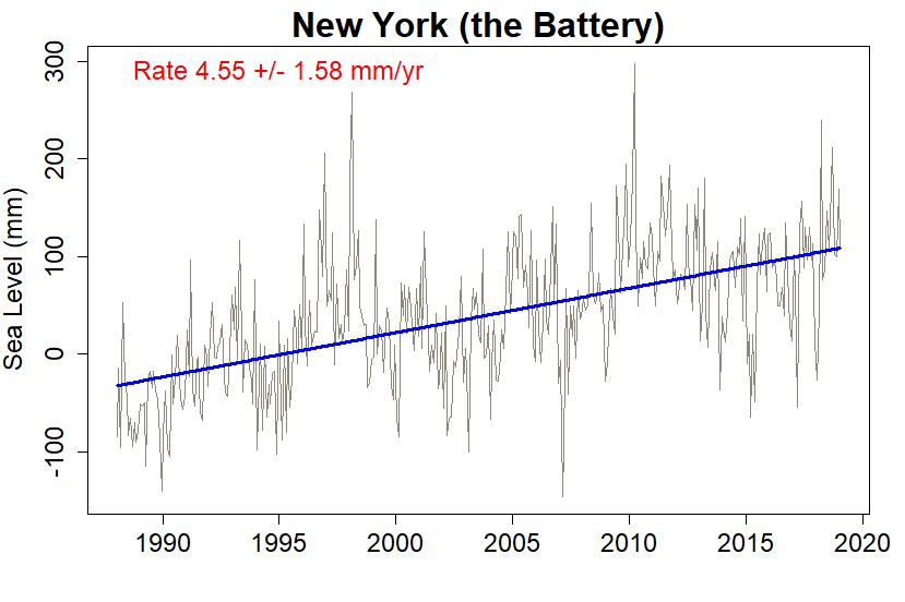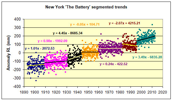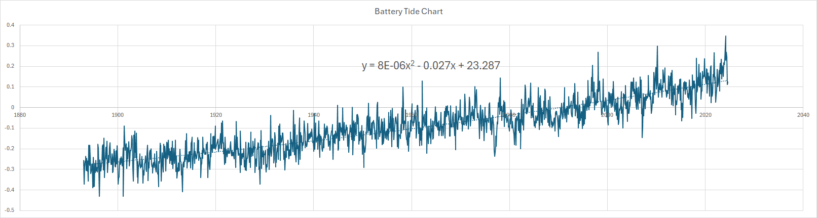To illustrate findings, I have used the New York Battery data as recently discussed by Kip Hansen (1). These cover the period 1856 to 2024 but due to the hiatus in data between 1878 and 1893 only the period 1893 to 2023 will be considered as 131 continuous years. Note there were a few months missing in 1920, but this has little impact.
