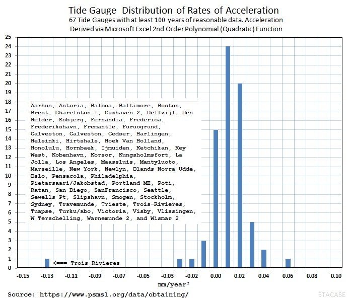 Just don’t kid yourself into thinking that quadratics/polynomials can tell you much about (most) data sets. And in particular don’t expect them to be able to predict the future or the past any more accurately than dartboard, a gypsy fortune teller or the current crop of climate models. And I wouldn’t put much faith in the “accelerations” derived from them. The dimensions will be right for an acceleration. But that’s most likely the only thing that will be right.