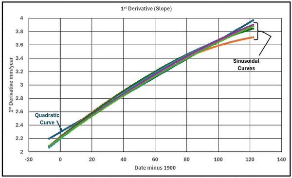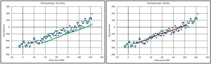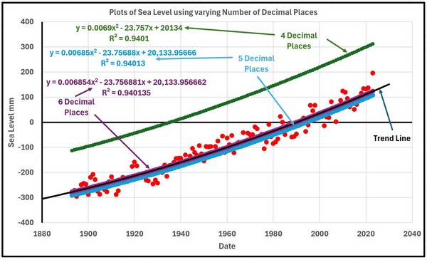 As values the coefficients of the Trend Line Equations are accurate to the precision given and usable as such. The problem arises if the equations, especially the quadratic coefficients, are used in subsequent analyses such as graph plotting and, although not recommended, extrapolation. The problems in plotting are illustrated below where the trend line equations are subjected to “Trend Line Formatting” increasing the significant decimal places to 5 and 6 respectively. With the standard Excel presentation there is a consistent error of nearly 200 mm. This comes about because the date values are squared and when multiplied by a coefficient with only 4 decimal places result in the calculated sea levels becoming basically the difference between two large numbers. Even with 5 decimal places there is a general error of about 15 mm. It is only with 6 decimal places that the error reduces to less than 1 mm.