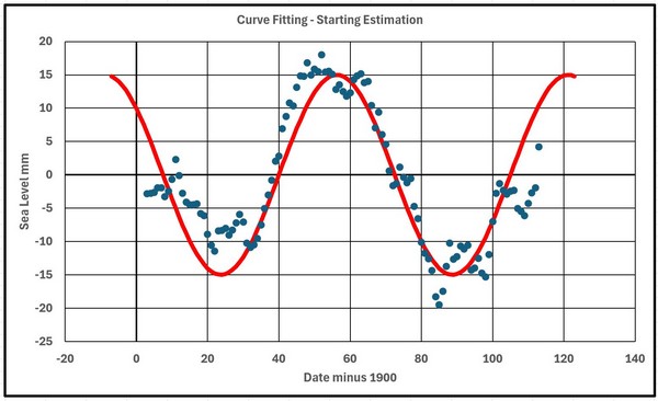The quadratic curve may be one of many other equally well-fitting curves. In this instance another class of curve could be long term sinusoidal variation and the following shows how a series of sinusoidal curves can be generated and compared.