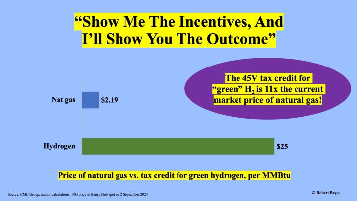 As I explained here on Substack last month, the subsidies for “green” hydrogen are 1,900 times larger than what’s given to nuclear. In that piece, I quoted the late Charlie Munger, who famously said, “Show me the incentives, and I’ll show you the outcome.” I wrote, “Under rules published earlier this year by the Treasury Department and Internal Revenue Service, hydrogen producers can collect $3 per kilogram of hydrogen under the production tax credit if they use electricity from low- or no-carbon sources.” As I noted, the energy content of hydrogen is about 120 megajoules (MJ) per kilogram. When converted into Btu, that works out to a subsidy of roughly $25 per million Btu. As seen above, that means that the subsidy for green hydrogen is 11 times the current market price for natural gas.