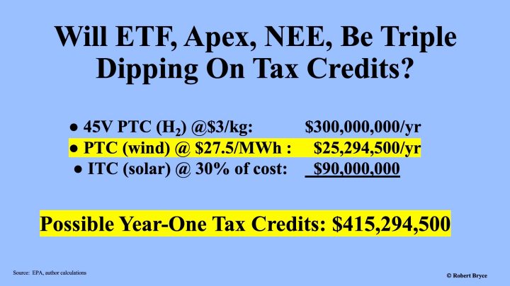 In addition, the companies that produce “green” hydrogen may — repeat, may — also be able to collect tax credits for the energy they produce from the sun and the wind. The result, as seen in the slide above, is that for a project costing $800 million, which is the estimated cost of ET Fuels’ Tierra Alta project, the developer could collect more than half of that sum courtesy of federal taxpayers. Note that I’m hedging my statement here because the rules on the tax credits are hazy. That said, it’s clear that the 45V tax credit alone for green hydrogen could provide more than a third of the project’s cost in the first year alone.