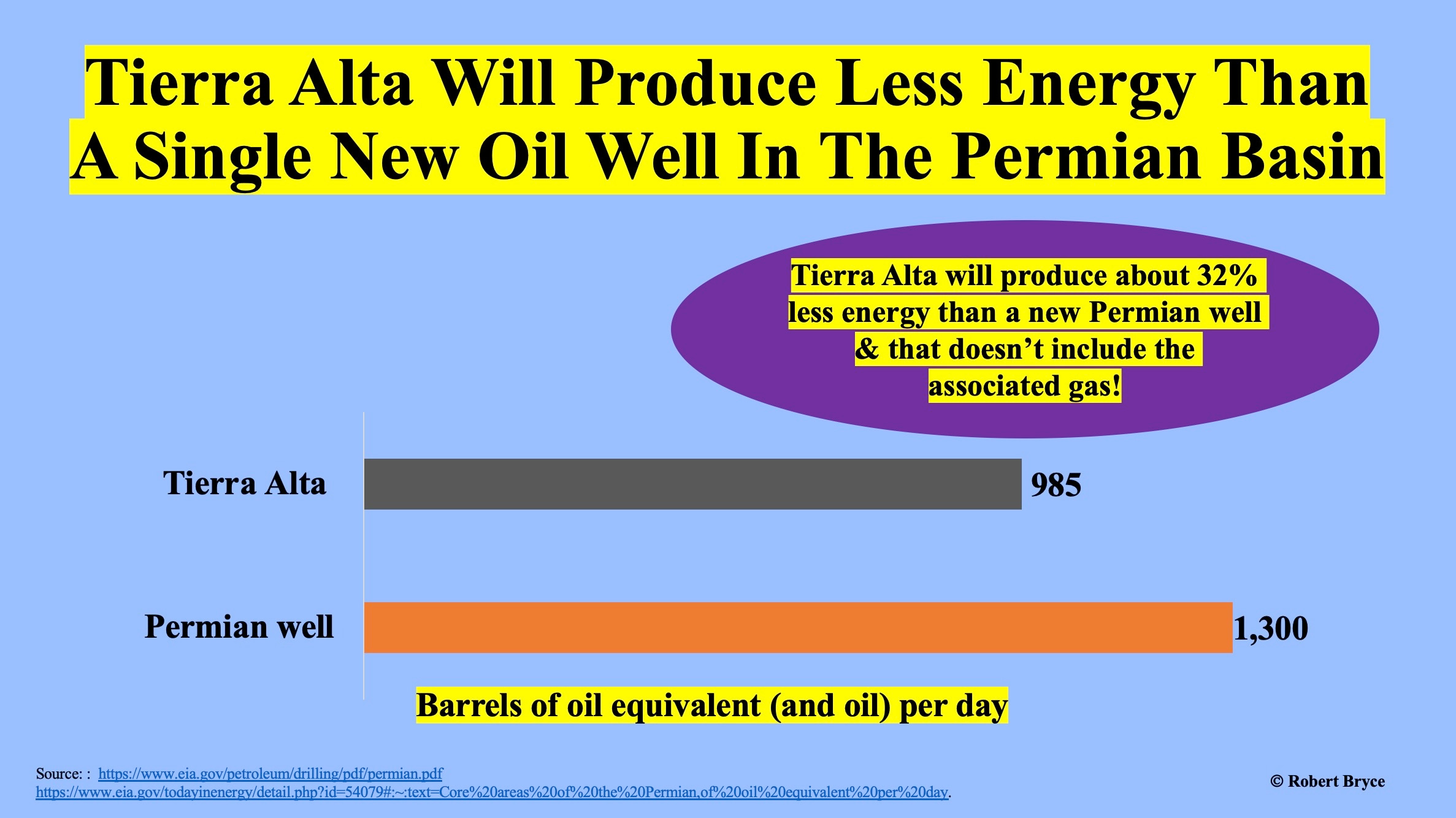 In the big picture, particularly in Texas — which produces more oil and gas than all but two or three countries — that’s a minuscule amount of energy. As seen above, the latest data from the Energy Information Administration shows that new oil wells in the Permian Basin, which is located about 150 northwest of Eldorado, are now producing about 1,300 barrels per day. And remember, that output doesn’t include the energy in the associated gas coming out of that well. And remember, the ET Fuels project will require covering some 47 square miles of ranch land with alt-energy stuff, and all of that alt-energy stuff will require using untold tons of steel, copper, concrete, wire, and untold tons of gravel for untold miles of new roads. And remember, in the Permian, a dozen or more wells are often drilled on a single multi-acre pad. Thus, while the surface footprint of the oil and gas industry is getting drastically smaller, the alt-energy sector is hoping to cover hundreds, or even thousands, of square miles of rural America with wind turbines and solar panels in its never-ending quest for ever-larger government handouts.