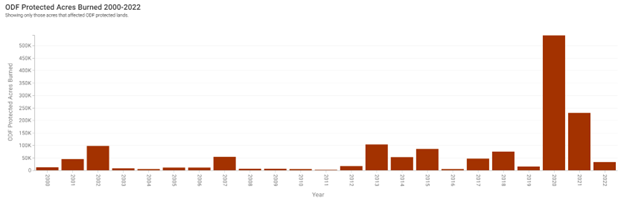 Regarding wildfire, OPB reports that Oregonians say it’s harder to go hiking and other outdoors activities because of wildfire smoke and heat. Again, the data does not support the anecdotal claims of select hikers cited in OPB’s story. In this case, the perception of hikers simply doesn’t match reality. Except for two years of outliers in 2020 and 2021, the Oregon Department of Forestry’s own data show that there has not been any trend in wildfire burn acreage. (See figure below)