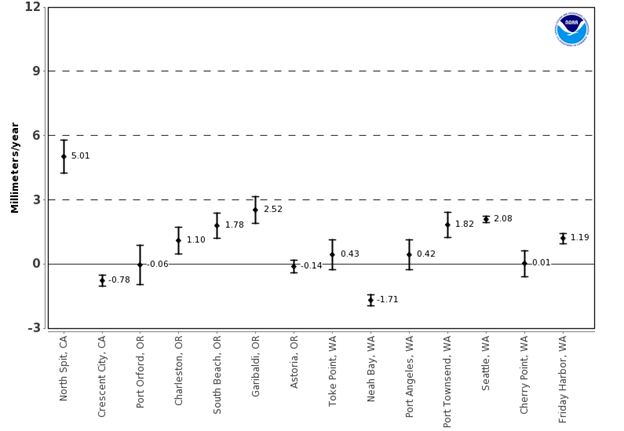 These are hardly unmanageable rates of change, the regions affected have plenty of time to react to less than 3 mm per year. Even the highest rate of sea level rise measured by NOAA in Oregon is well below the 1.4 to 2.75 feet of average global sea level rise forecast by the Intergovernmental Panel on Climate Change in its most recent report.