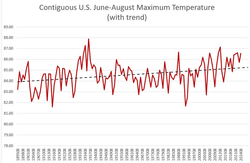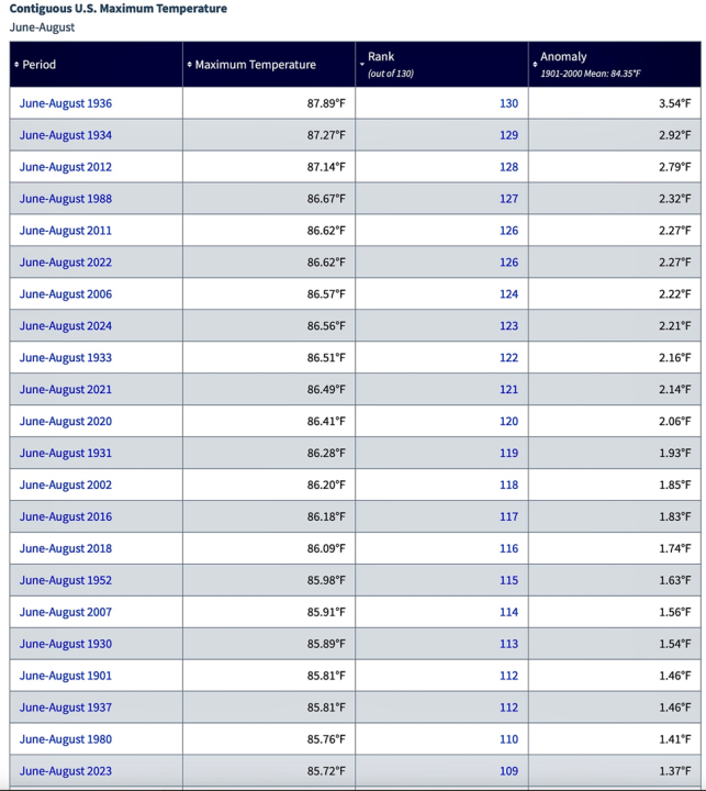 NOAA has released its summer 2024 (June through August) contiguous U.S. maximum temperatures (shown below) clearly demonstrating the dust bowl era period of the 1930’s remain the highest summer temperatures measured in the U.S.