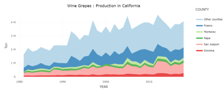 Also, production numbers for red grapes indicate that their output has not been harmed by recent temperatures. Figure 3, below, tracking grape production in California, with Napa in green, shows a steady increase in in tonnage harvested, not just in the Napa region, but for all regions: