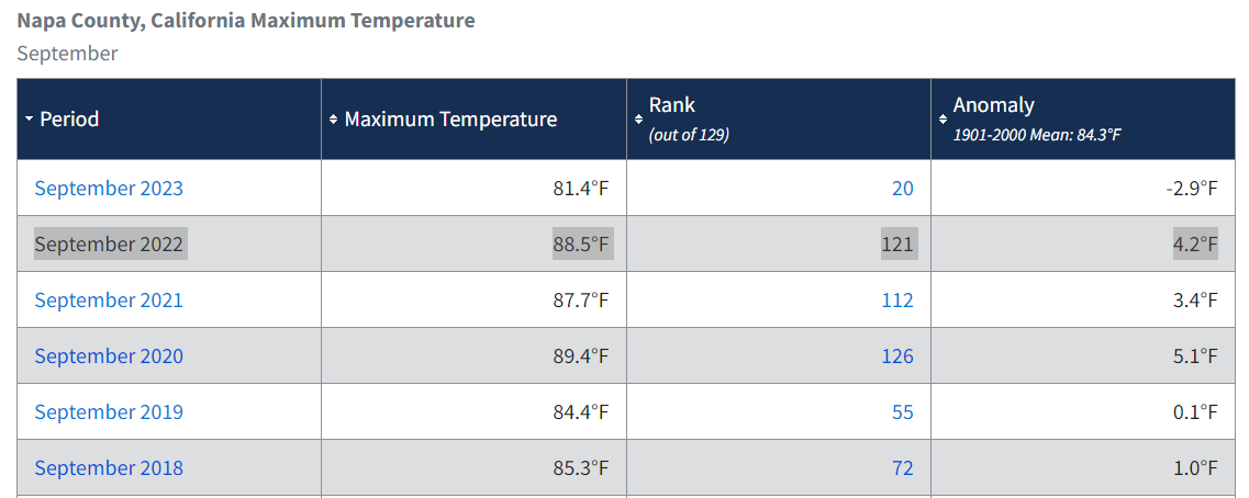 First, the author Lauren Sommer is conflating a short-term heat wave with long term climate change. Secondly, according to temperature records, while Napa valley set a new high temperature record of 114°F on September 6th 2022, it was only a degree hotter than the previous high temperature record of 113°F, set 61 years of global warming ago, in 1961.