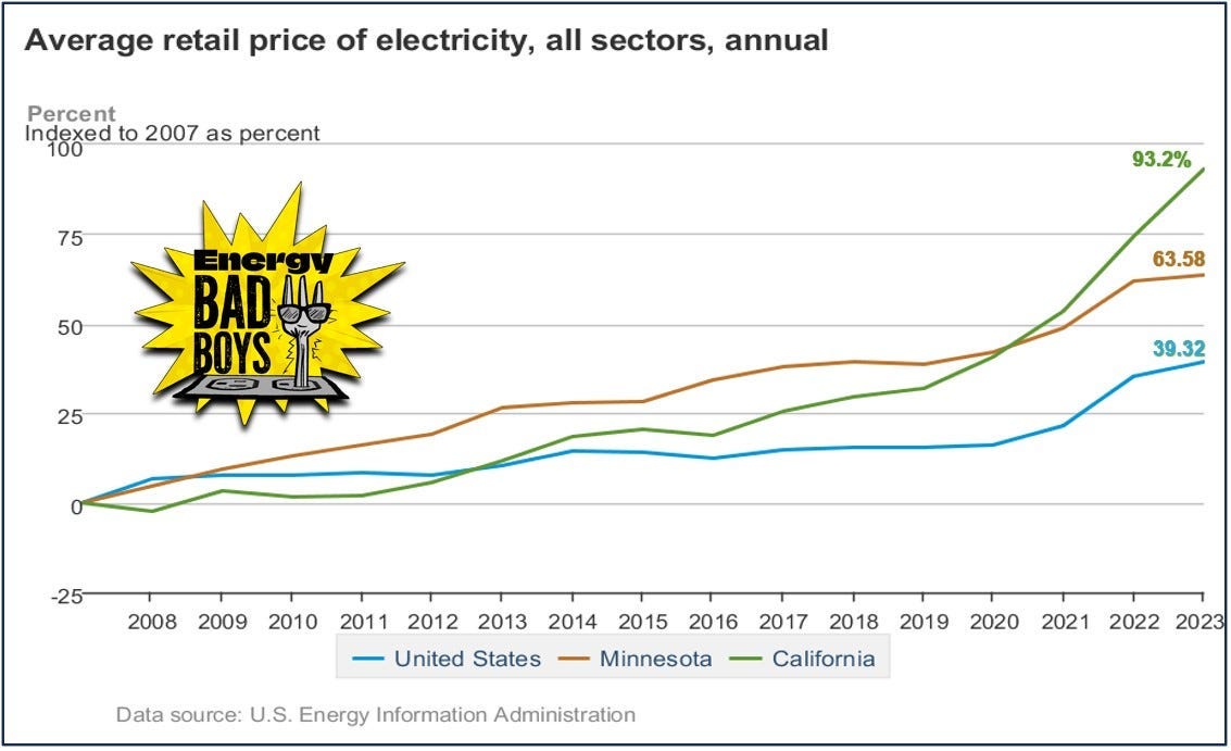 We aren’t building a new electric grid from scratch, so we should be comparing the cost of new wind and solar with the cost of existing power plants that these intermittent generators would hope to replace. The truth is that we already have reliable, depreciated assets that produce electricity at low cost, and they could’ve kept doing so for decades. This means that building new wind and solar adds to the cost of providing electricity to the grid. If wind and solar were truly lower cost than other forms of energy, we would expect states like California and Minnesota, which have high penetrations of wind and solar, to see falling electricity costs. Instead, electricity prices in these states have increased much faster than the national average.