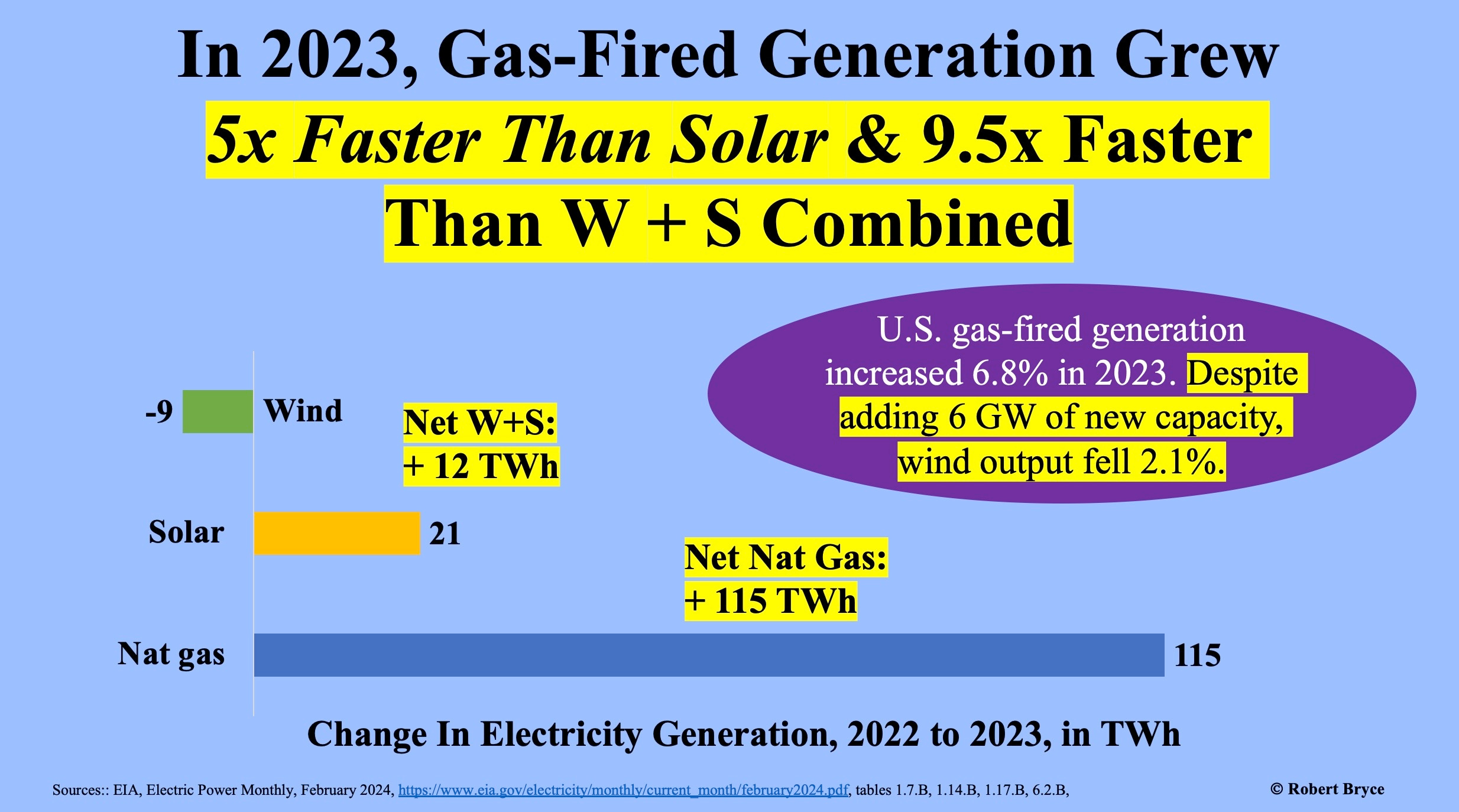 As seen above, that growth continued last year when gas-fired generation grew by 115 terawatt-hours while solar increased by 21 TWh. Put another way, gas-fired generation grew five times faster than solar last year.