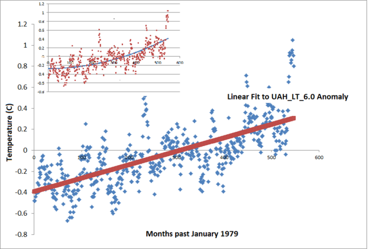 I decided to perform a little experiment with the uahncdn_lt_6.0 dataset (University of Alabama, Huntsville). I used an ordinary least squares linear regression. The month to month linear coefficient of increase is 0.0013C, and the 95% confidence interval runs (0.0012 to 0.0014 C/month). Figure 4 shows this. As Dr. Spencer has written on his blog, this 0.02C change per year is what results from increased CO2 forcing and anything departing from it is some influence of climate variability.