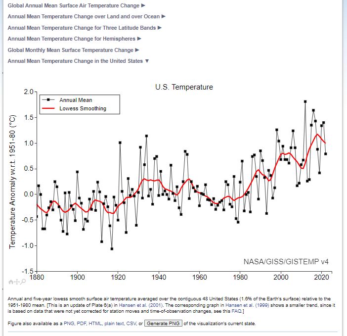 Looking at a (much) more up to date graph …. it seems that the US has indeed pretty much seen the same “1.3C rise in temperatures that Nick is referring to”