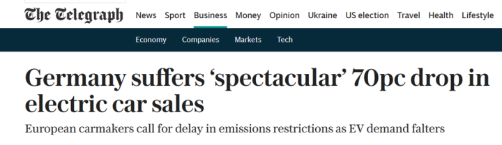 “. . . ‘the spectacular drop’ in both countries meant that only 92,627 battery electric vehicles were registered across Europe last month, a fall of 43.9pc compared to a year earlier.”