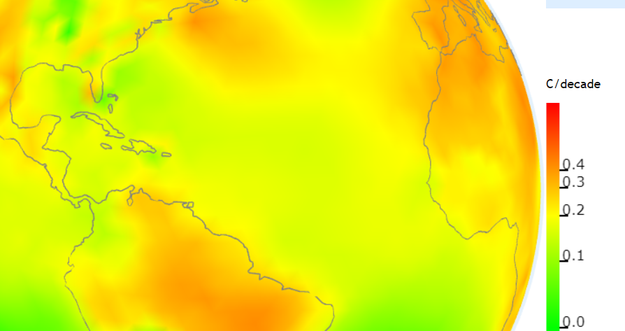 What you have plotted is total ocean heat, not warm surfaces. SST has increased. Here is a plot of trends over the 5 decades 1971-2020. Even the green areas near Florida signify 0.5 degrees of warming.